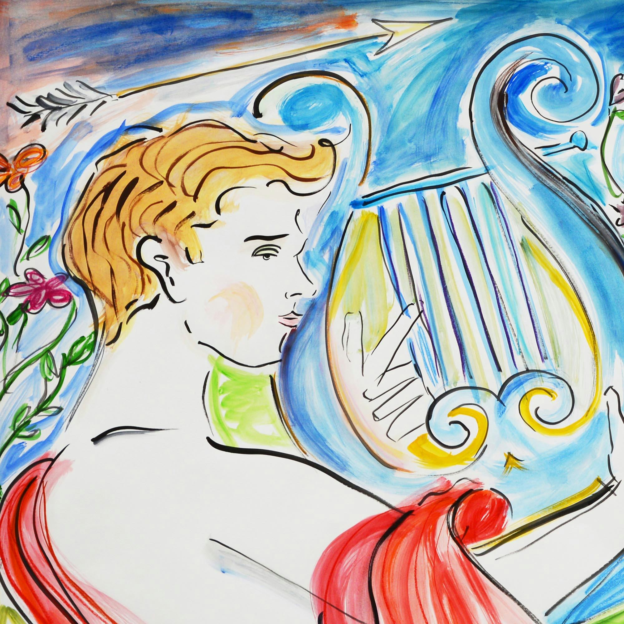 Luke's inspiration for the curtain design came from the Coliseum itself and the Roman grandeur of its richly decorated interior. He drew upon his love of the mythology of Ancient Greece and Rome and created a scene in which Orpheus, the legendary poet and musician, is seen playing his violin beside the lyre-playing Apollo, god of music and dance.