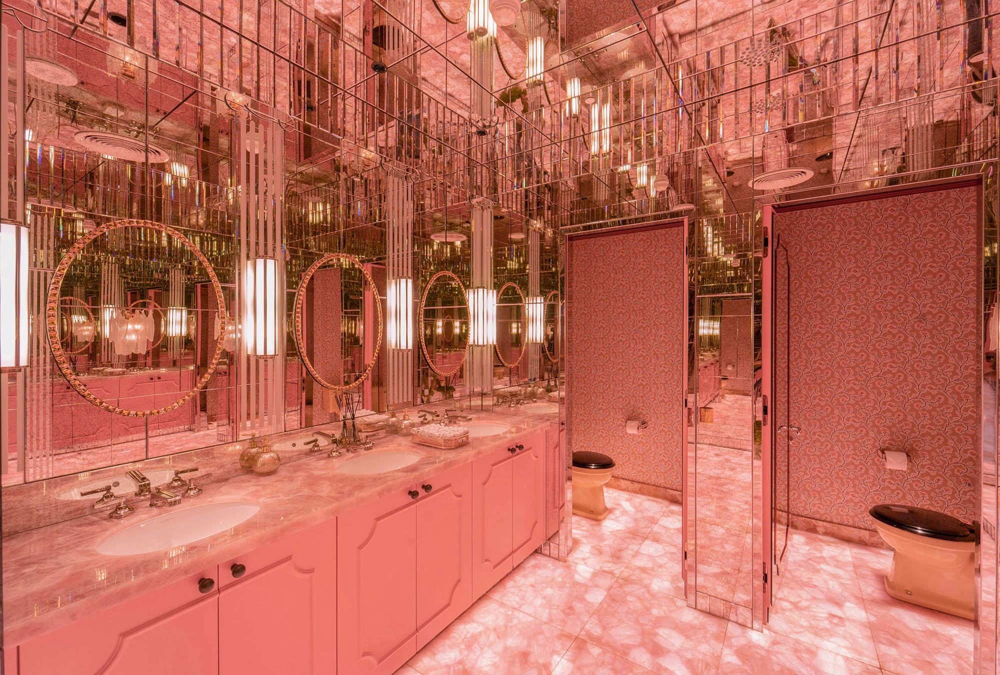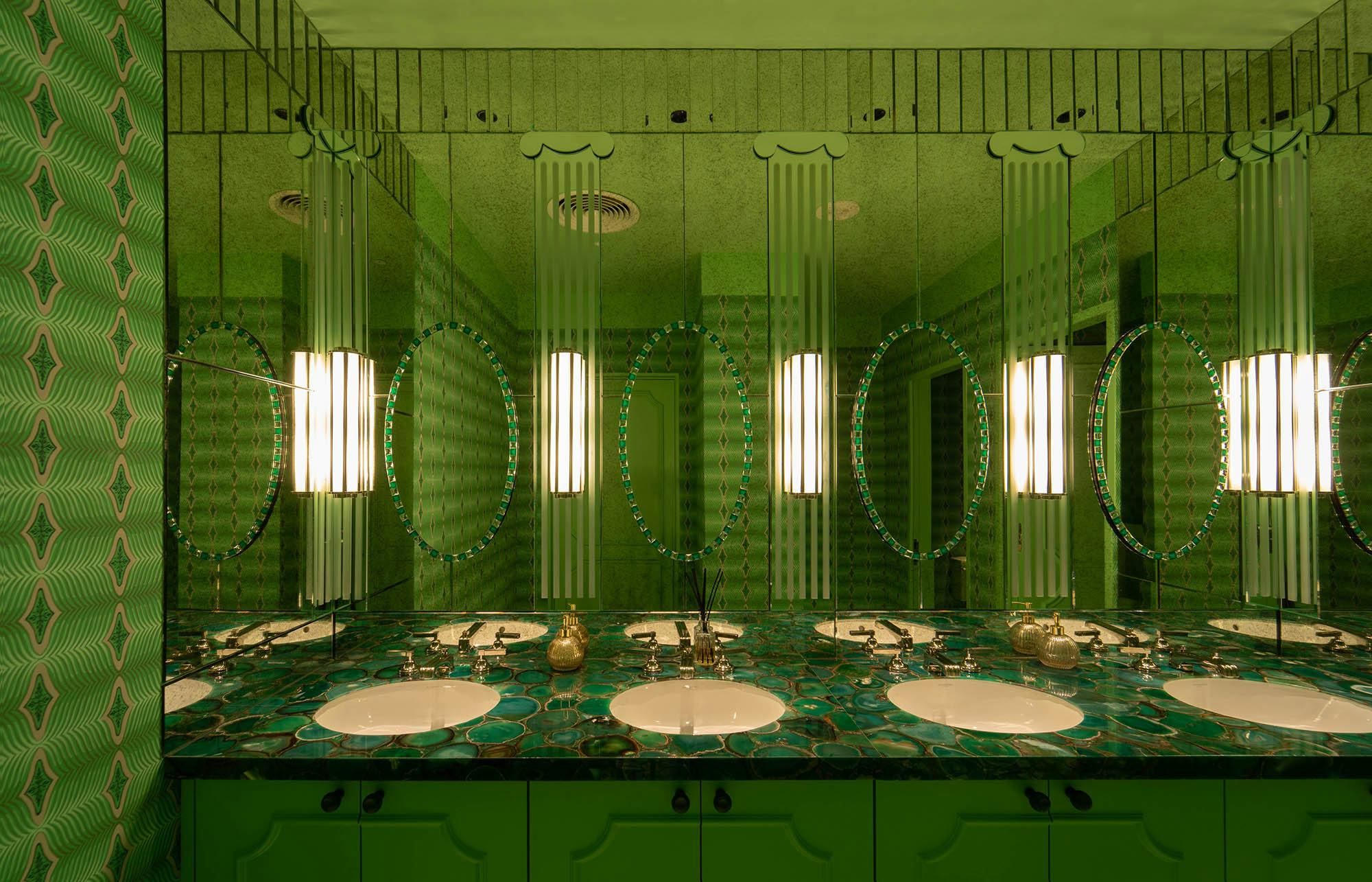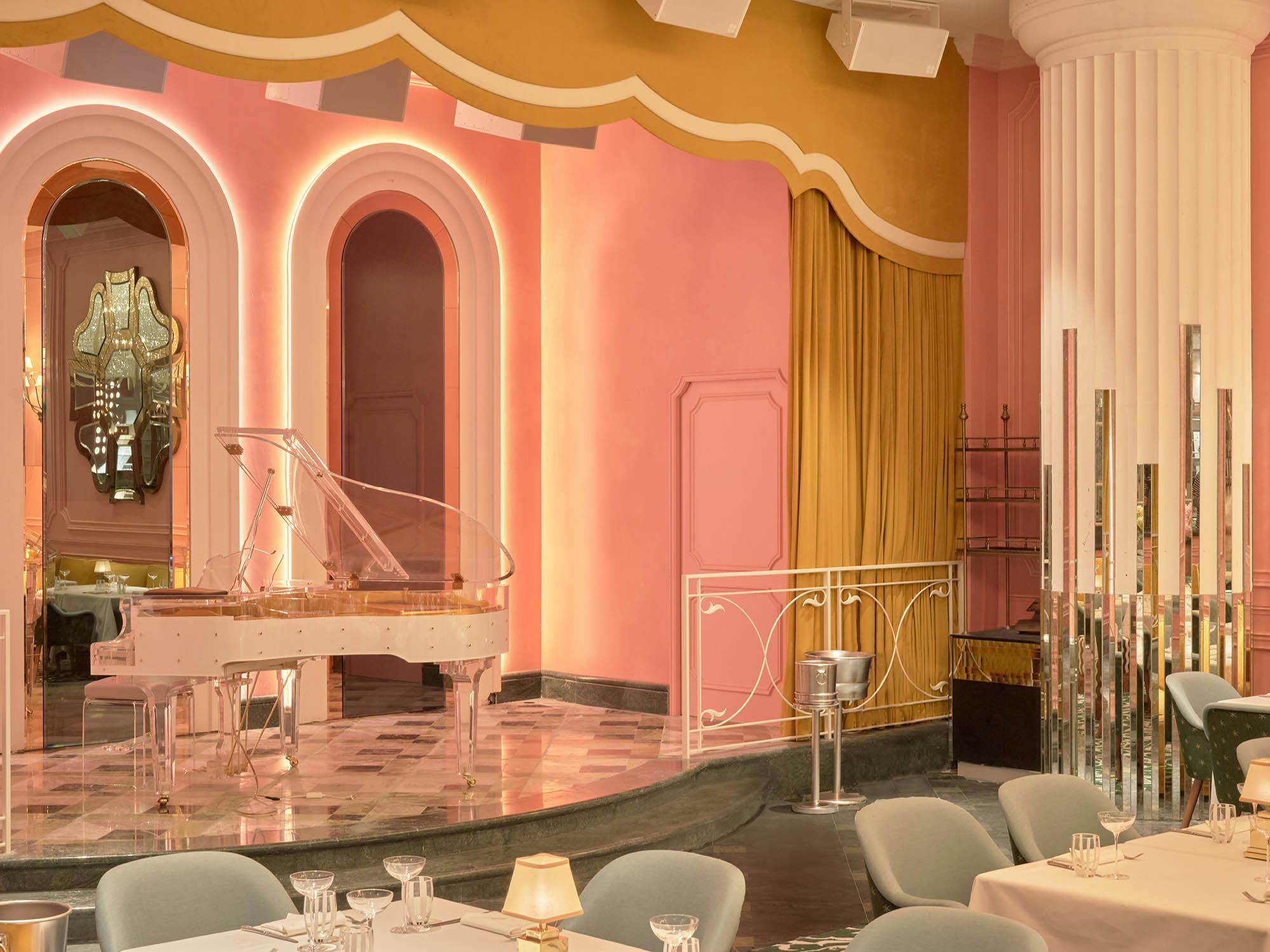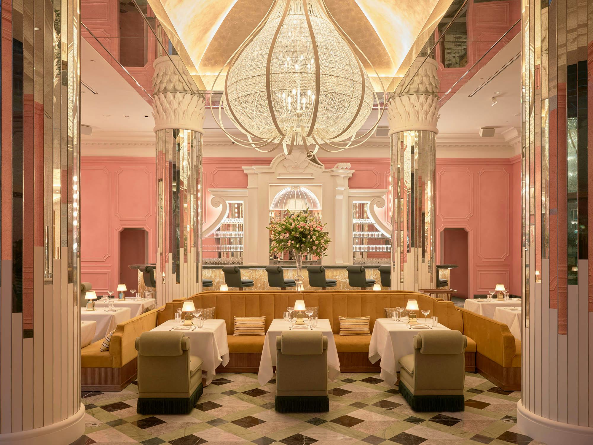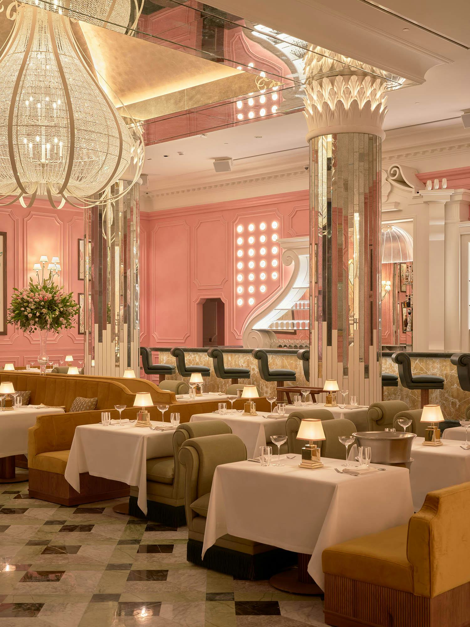 “The design is in part a sort of tribute to two of my decoration heroes: Syrie Maugham (mirrors, plaster, elegance!) and Dorothy Draper (theatre, oversized scale, Baroque bombast!). The oversized columns with their leafy plaster tops and half mirrored panels take their inspiration from columns at one of my favourite houses, Villa Lysis on Capri, whilst the white-painted metal birdcage chandeliers are a total homage to the ones Draper installed in the classical wing-cum-cafeteria at New York's Metropolitan Museum of Art in the 1950s. High above, ceilings are covered in silver leaf.”