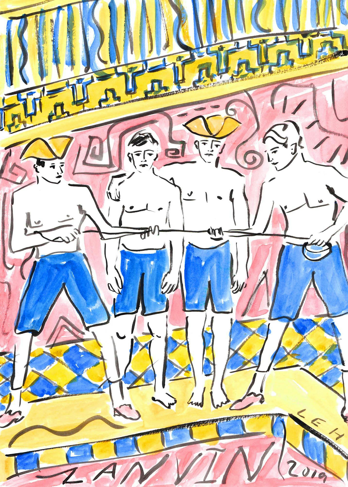 Sialelli commissioned Luke to design the invitation for his debut menswear show, which took place in June 2019. Taking inspiration from the show's location – the light-filled, Lucien Pollet-designed Pailleron swimming pool in the 19th arrondissement of Paris – Luke depicted four male swimmers in Lanvin-blue swimming trunks.