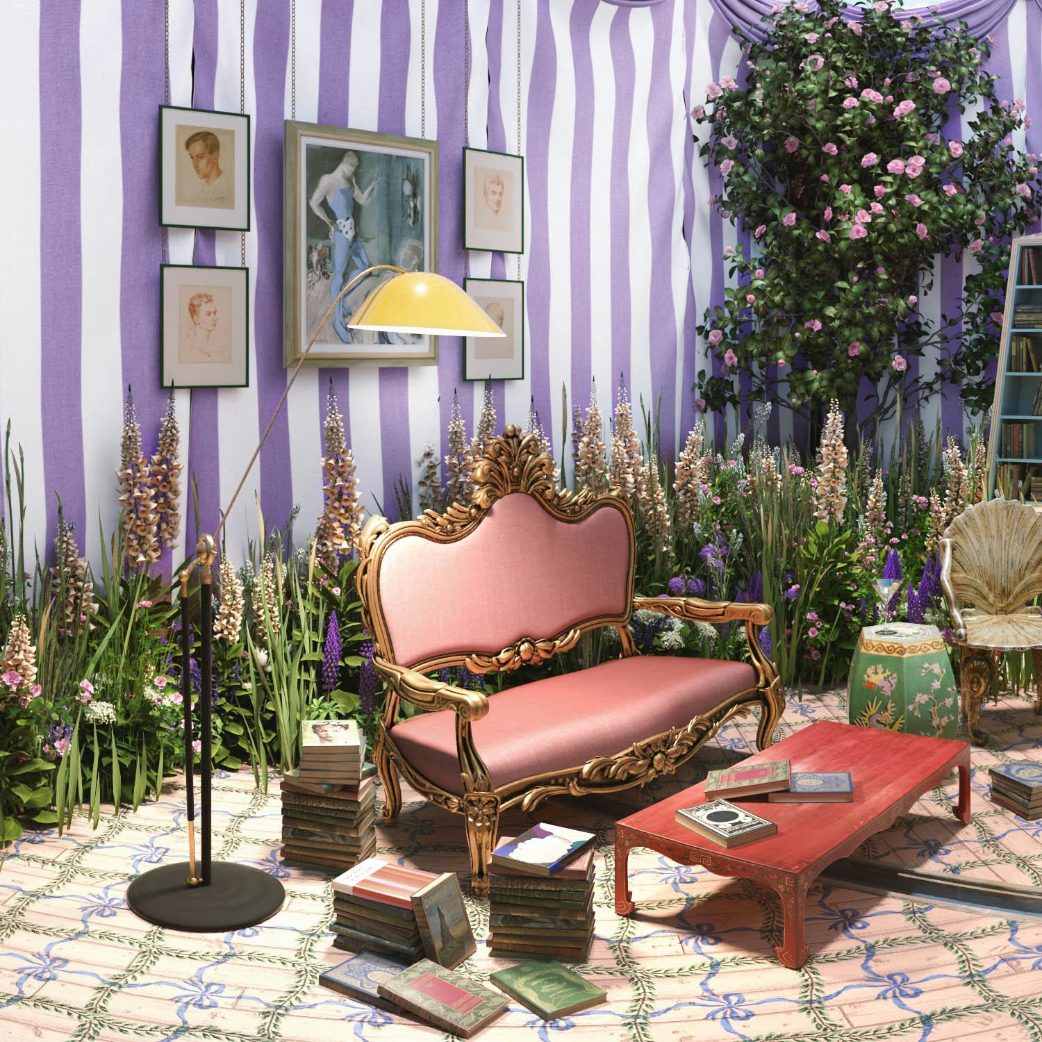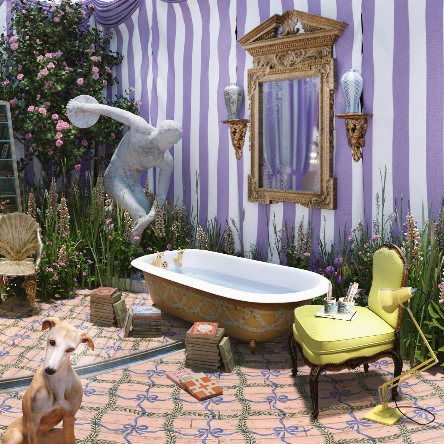 A 1970s desk sits at the end of the room, raised on a dais and underneath its own tented structure. Beautiful and useful objects are hidden among the plants: a pair of Venetian grotto chairs, a stone Discobolus statue, a pair of velvet slippers, countless piles of books and pots filled with paintbrushes. Essentially this room is Luke's idea of a dream studio: a space to work in, yes, but a space to lounge about in too, a space to fall asleep in among the foxgloves and tulips and buzzing bees, and a space for his silver whippet, Merlin, to enjoy. (We see him hidden among the flowers, too.) It takes much inspiration from Luke's own garden in the English countryside and his love of tented structures, as well as Tim Walker's photoshoots for Casa Vogue in the early 2000s that he is so incredibly fond of.