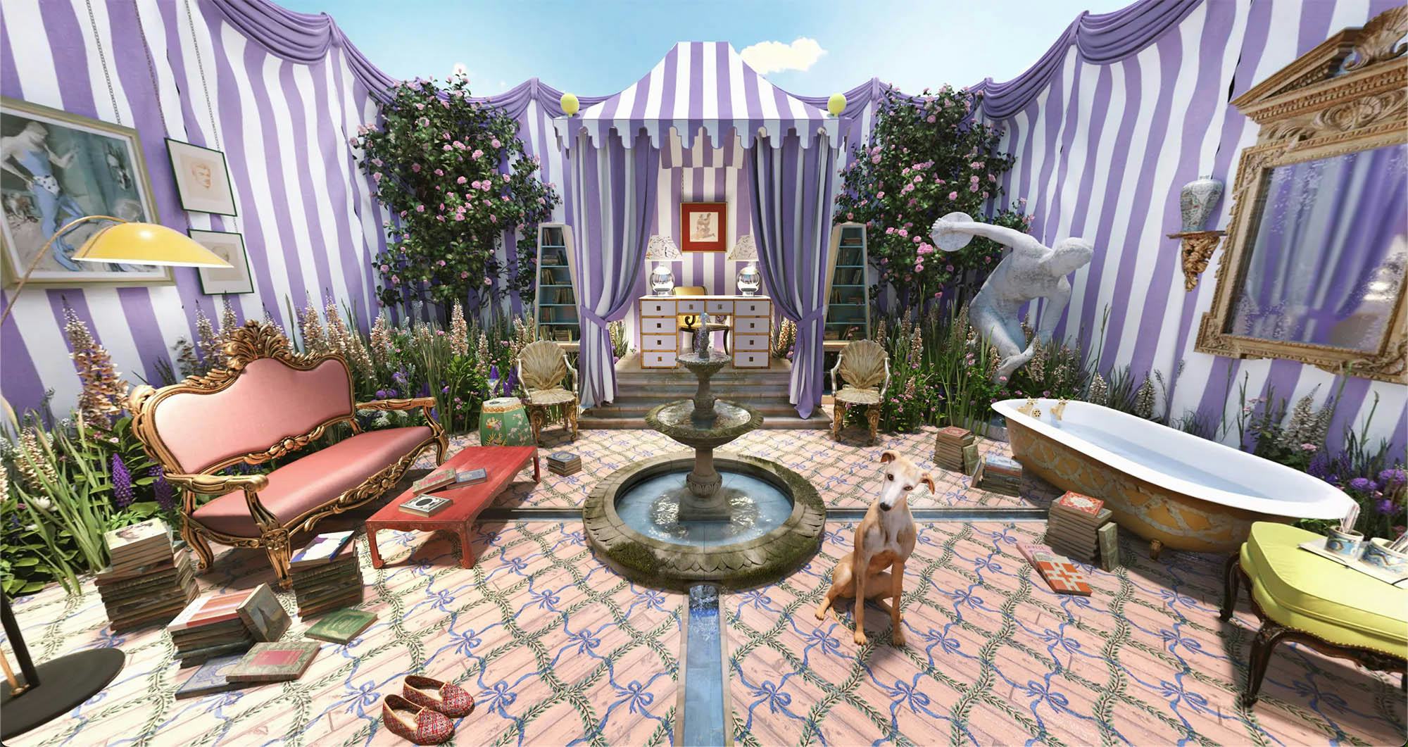 Luke's concept for the Art Director's room, which he called The Dreamer's Garden, revolved around the idea of a space that is half garden, half tented room. It is high summer and the boundaries have become deliciously blurred between indoors and outdoors, dreams and reality. We see a painted wooden floor and striped fabric walls, an old bathtub and a bright pink sofa, yet above the room cotton wool clouds float past, and wild plants and flowers are fighting their way up through the floorboards. At the centre of the room an old stone fountain provides a soundtrack of falling water, and from this fountain stone channels take the glistening water in four directions across the room, under furniture and out through arches in the tented walls.