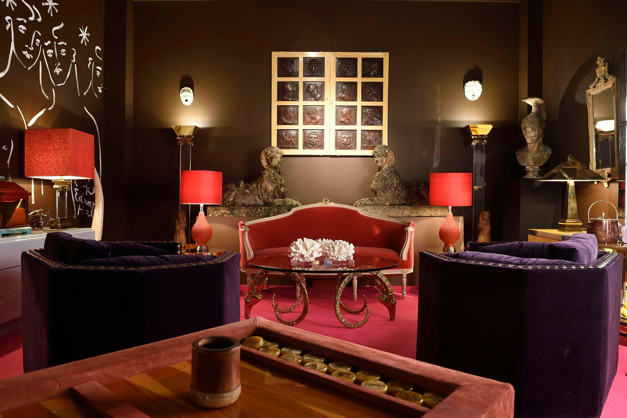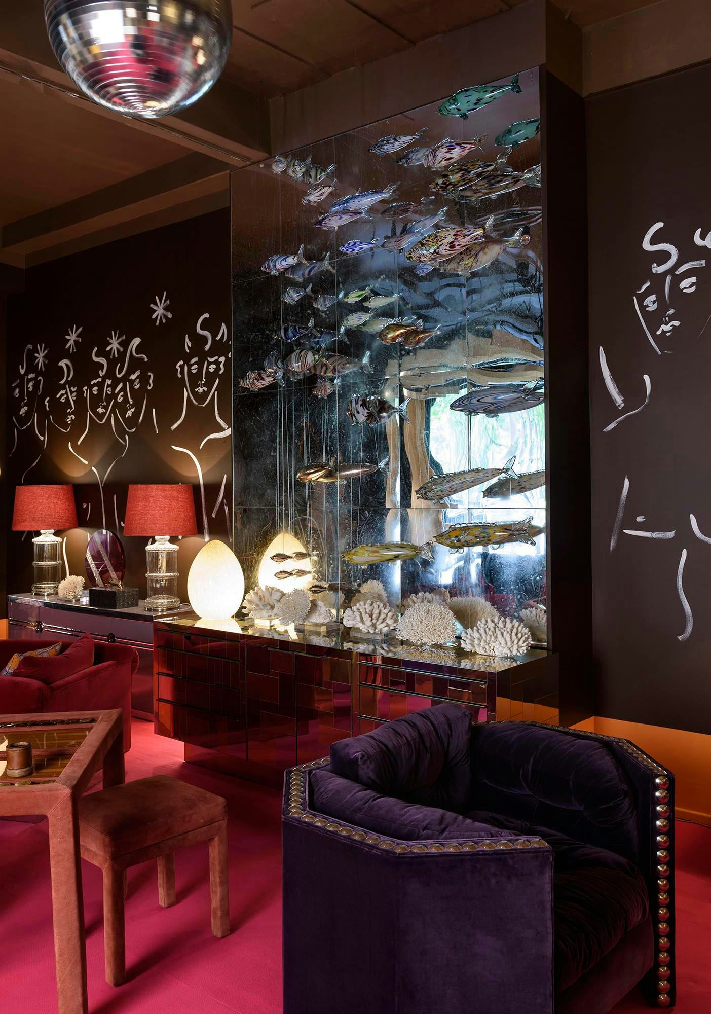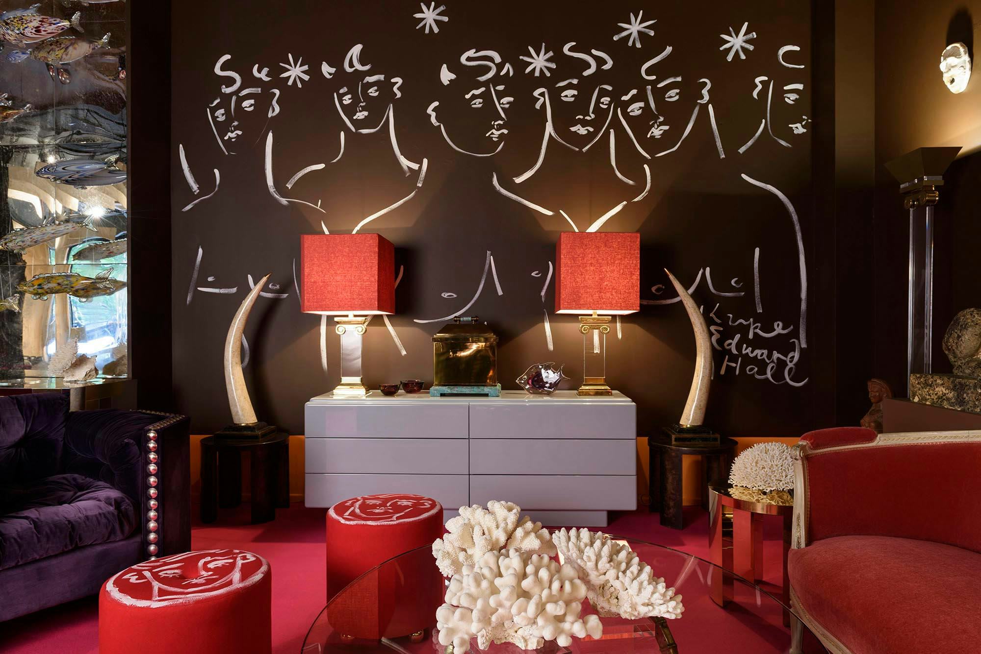 Luke put down a shocking fuchsia carpet, painted the walls chocolate brown and orange and installed a giant disco ball. Antiques on show included a shoal of magnificent Murano glass fish suspended from the ceiling and pairs of stone sphinxes and 17th century marble busts. To complete the room, Luke painted Bacchanalia-inspired murals on two walls and customised a set of Talisman stools with his mischievous painted faces.